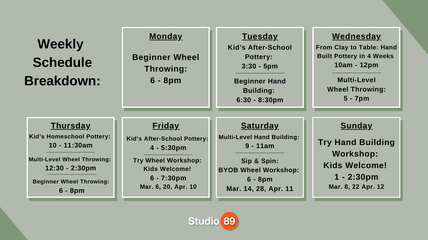 Welcome to Studio 89, your creative hub for all things pottery! Led by skilled ceramicists and teachers Amy Dooley and Sarah Bloom, our studio offers hands-on classes for all skill levels. Whether you're new to pottery or looking to refine your craft, Studio 89 is here to inspire and guide you every step of the way. Come explore, create, and connect with a community that shares your passion for pottery!
